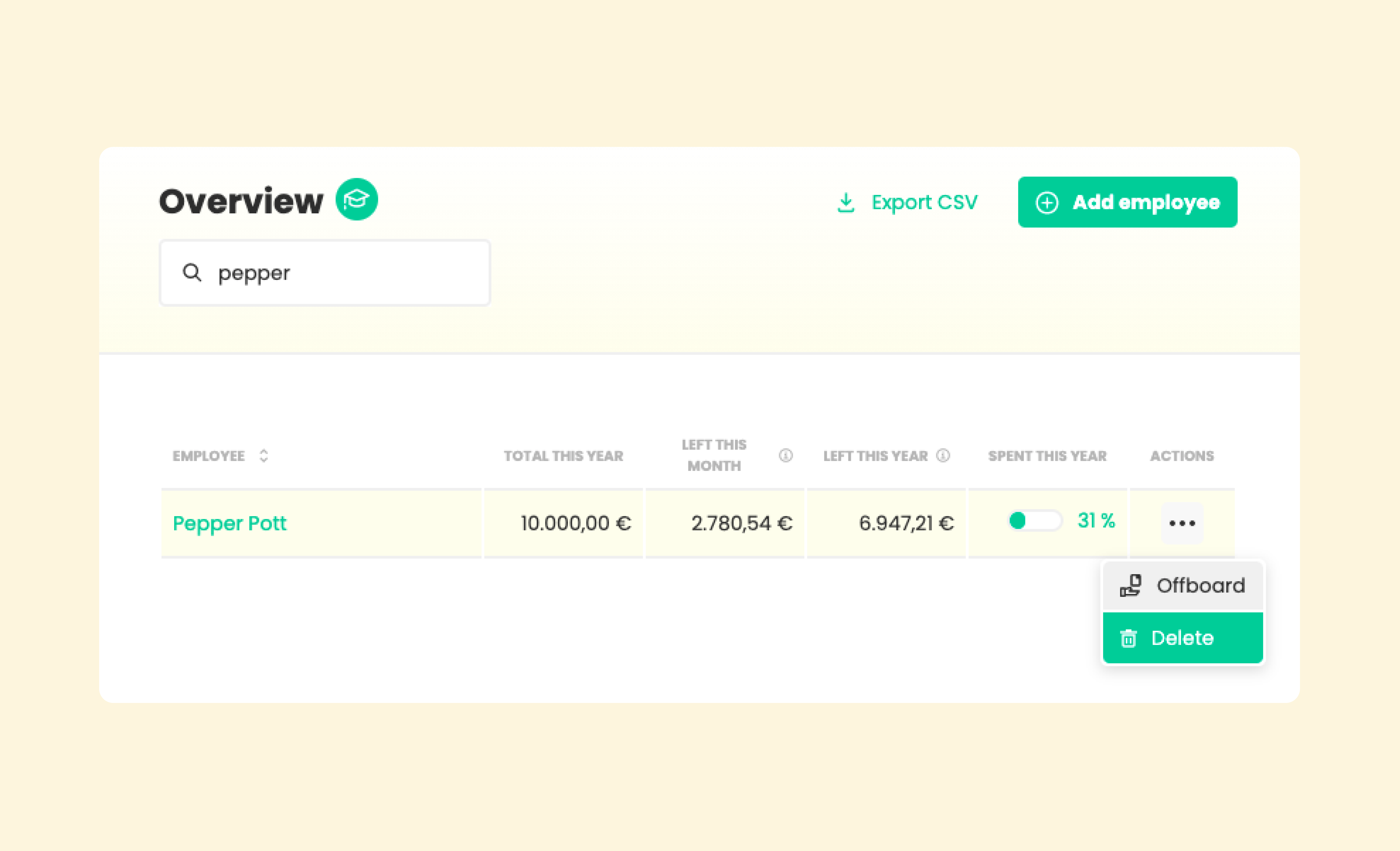 We continuously sync the Mbrella budget and employee data with Skipr. No other tool needed, everything is integrated.