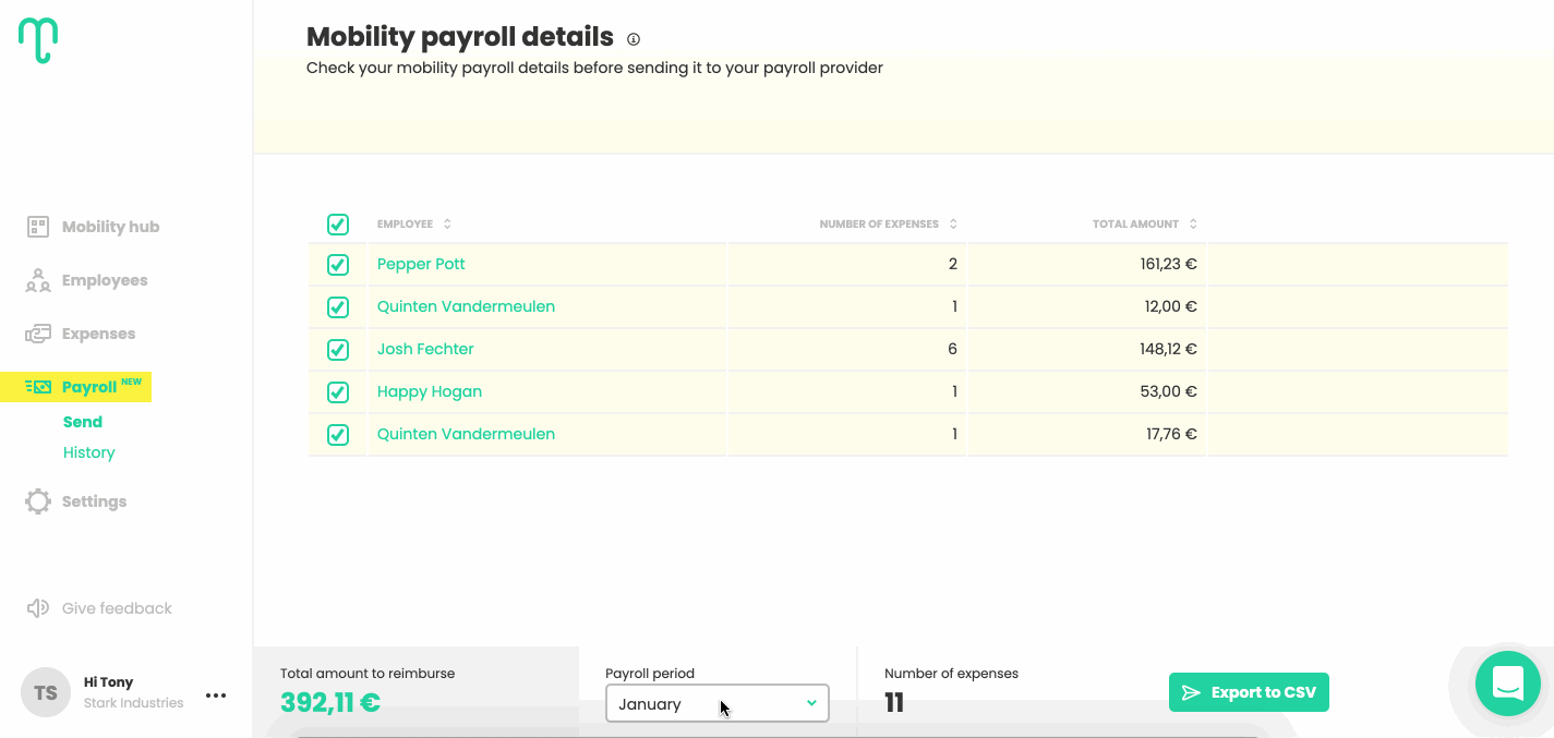 No more fixed cut-off dates. Download or send your mobility payroll export at any time to your social secretary. Once exported or sent, an expense's payroll status will change from Pending to Sent.