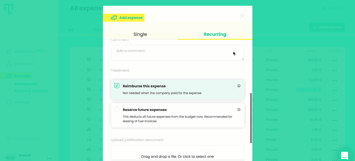 Mobility usage fees (like the monthly Mbrella price, or the price of any of our mobility partners) can now be deducted from your employees' budget. Use the 'Usage fee' category for this when creating an expense